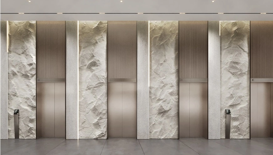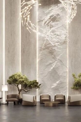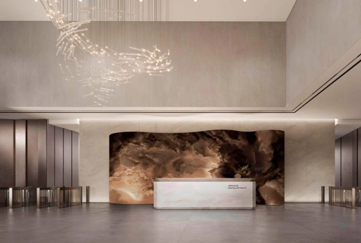 - Архитектурной доминантой стал вестибюль, вдохновлённый образом скалистого побережья. Волнообразные панели и световые инсталляции создают уникальную атмосферу, встречающую резидентов и гостей.