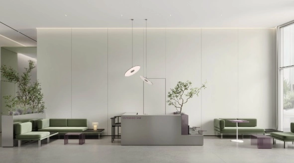 - Многофункциональное лобби: включает коворкинг, эспрессо-бар, зоны ожидания курьеров, банкоматы и вендинг.