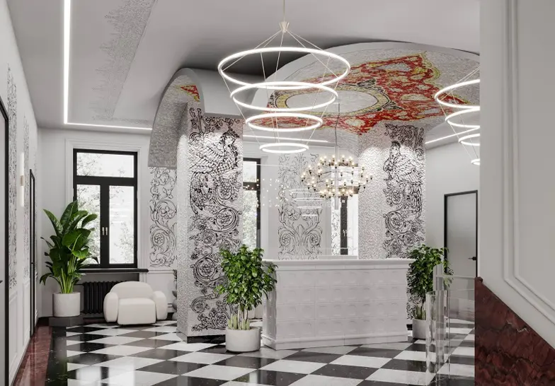 - Интерьеры оформлены в современном стиле, мостики к которому проложены ещё в холле светильниками, дверями из стекла, элементами из хромированной стали.При этом в графику и геометрию пространства вплетены отсылки к традиционным художественным промыслам России.