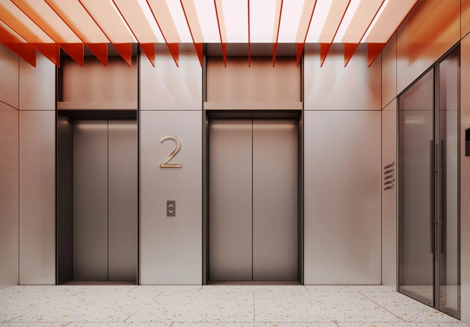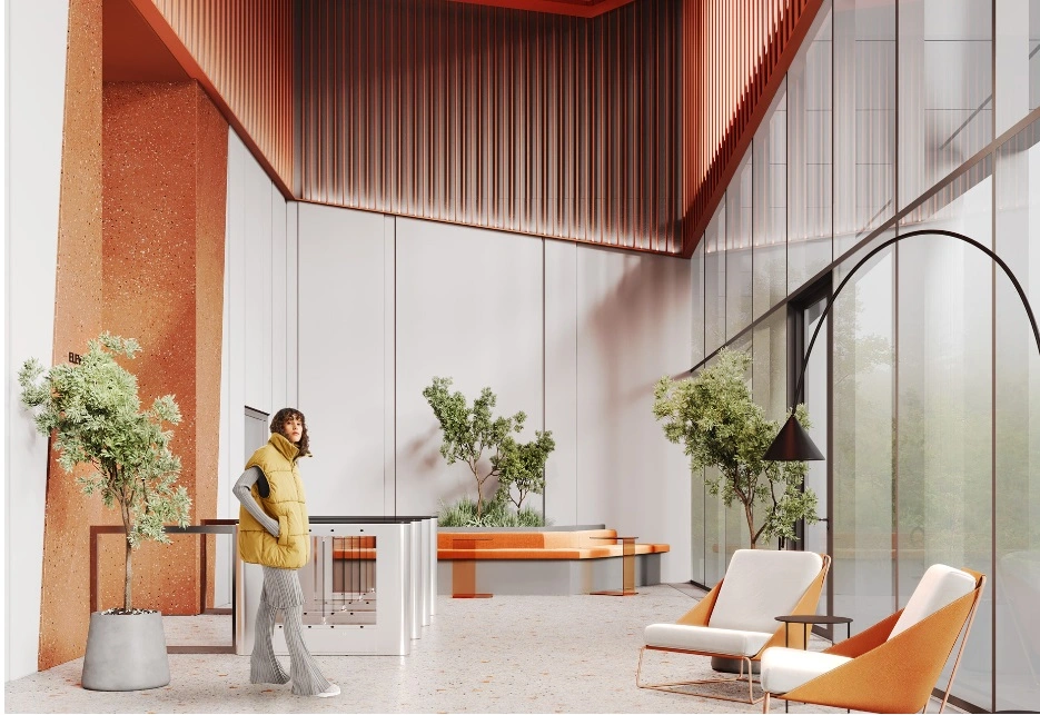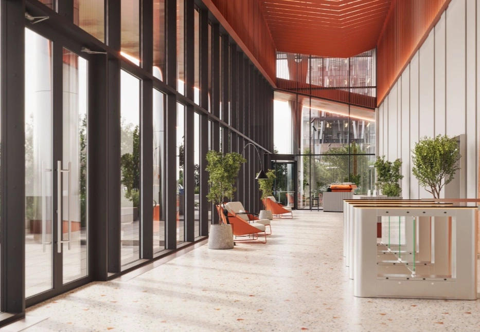 - Лобби QOOB наполнены светом и воздухом благодаря 9-метровым потолкам и витражному остеклению.
