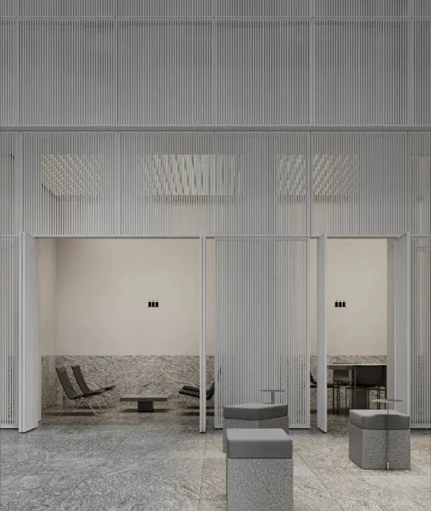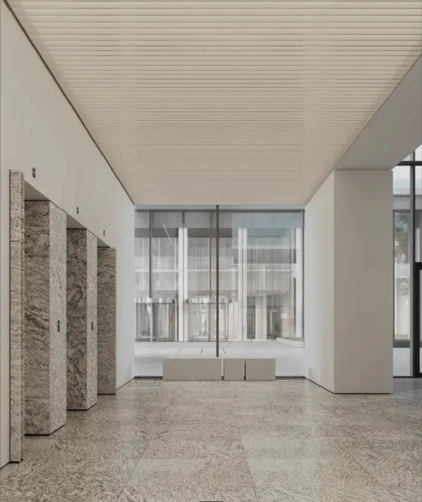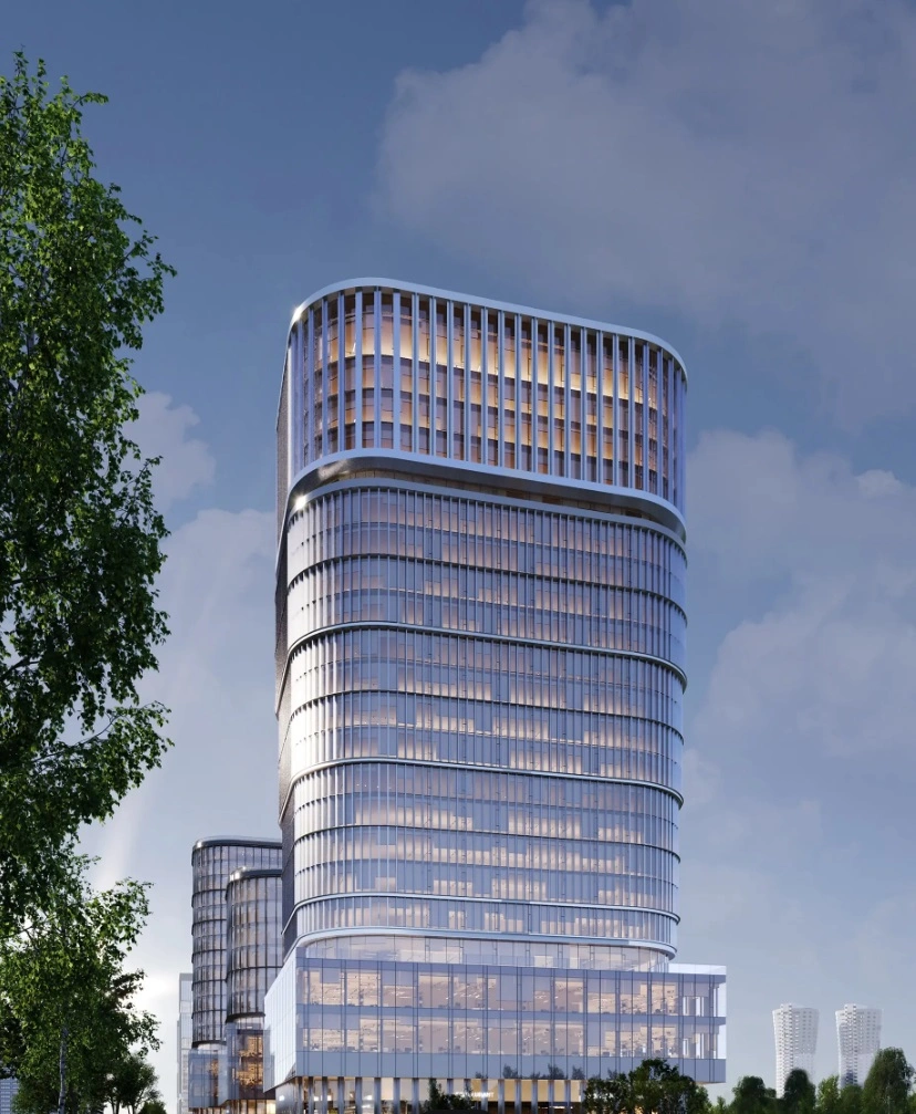 - Фасадный ритм: Гладкие плоскости стекла сочетаются с динамичными вертикальными алюминиевыми ламелями. Они не только создают выразительный графичный облик, но и выполняют функцию солнцезащиты, повышая энергоэффективность зданий.