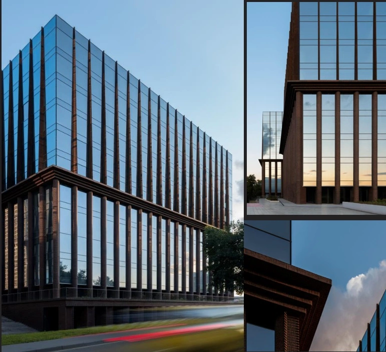 - Материалы: фасад из темно-красного клинкерного кирпича, благородной стали COR-TEN и панорамного стекла создает сдержанный и технологичный образ.