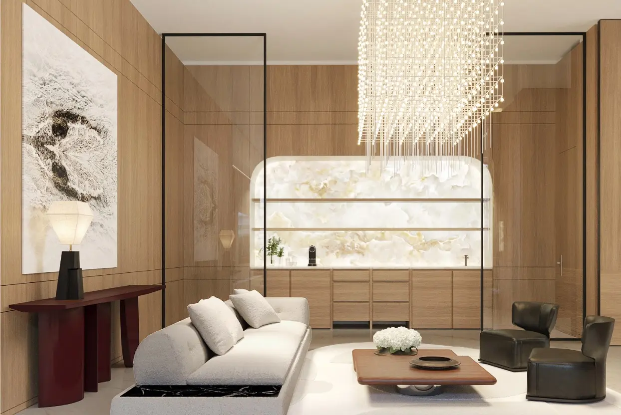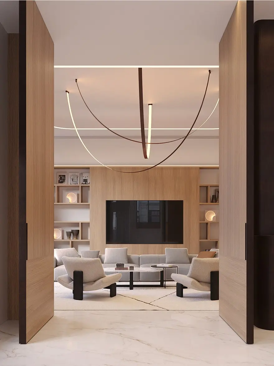 - Гибкость и уют: Раздвижные дубовые панели с бронзовой фурнитурой позволяют легко менять планировку, создавая то открытые гостиные, то камерные кабинеты.