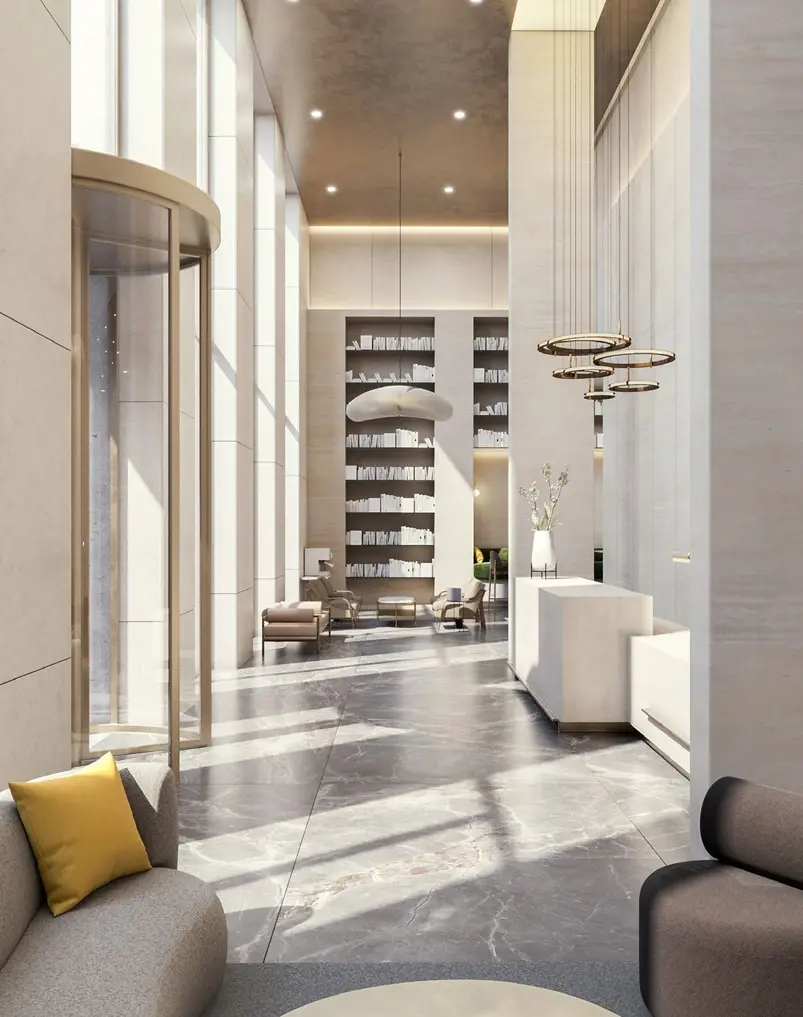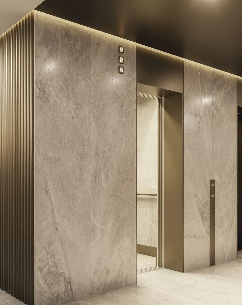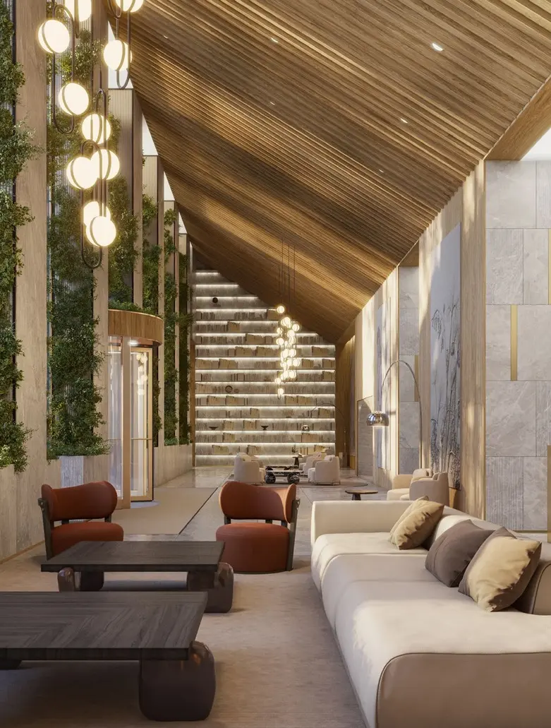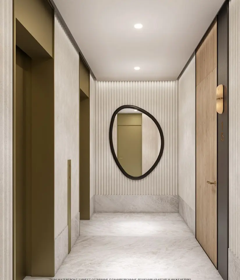 - Лобби оформлены мрамором, деревом и вертикальным озеленением.