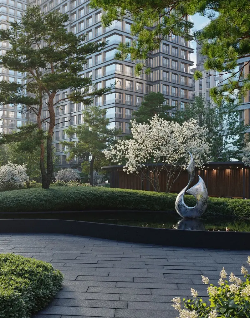 - Приватная территория площадью 8 га с ландшафтным дизайном, предназначенная исключительно для жителей комплекса.