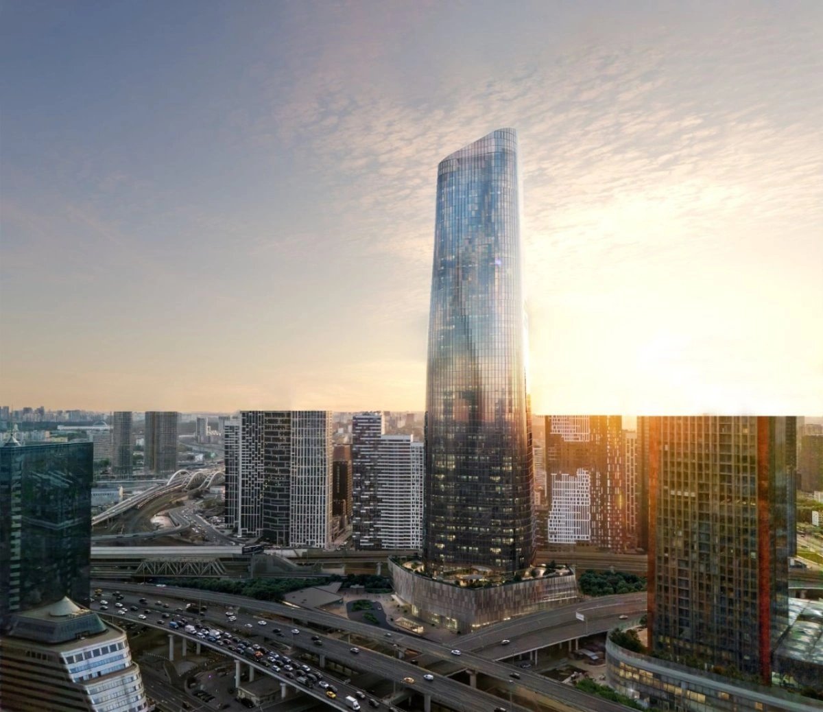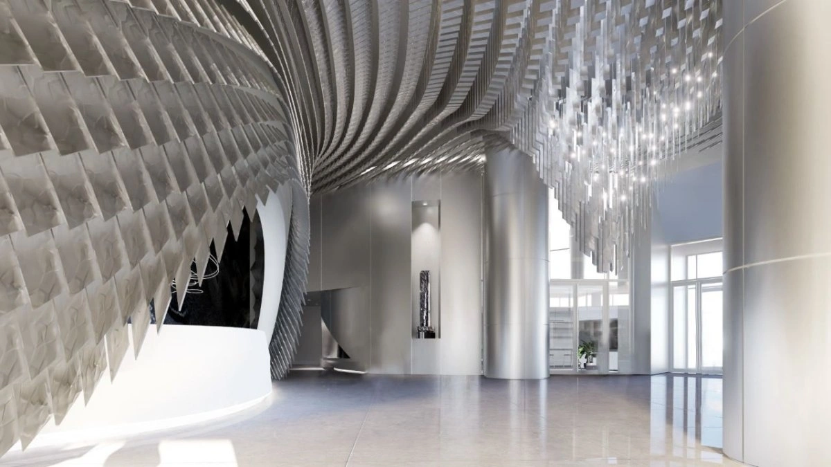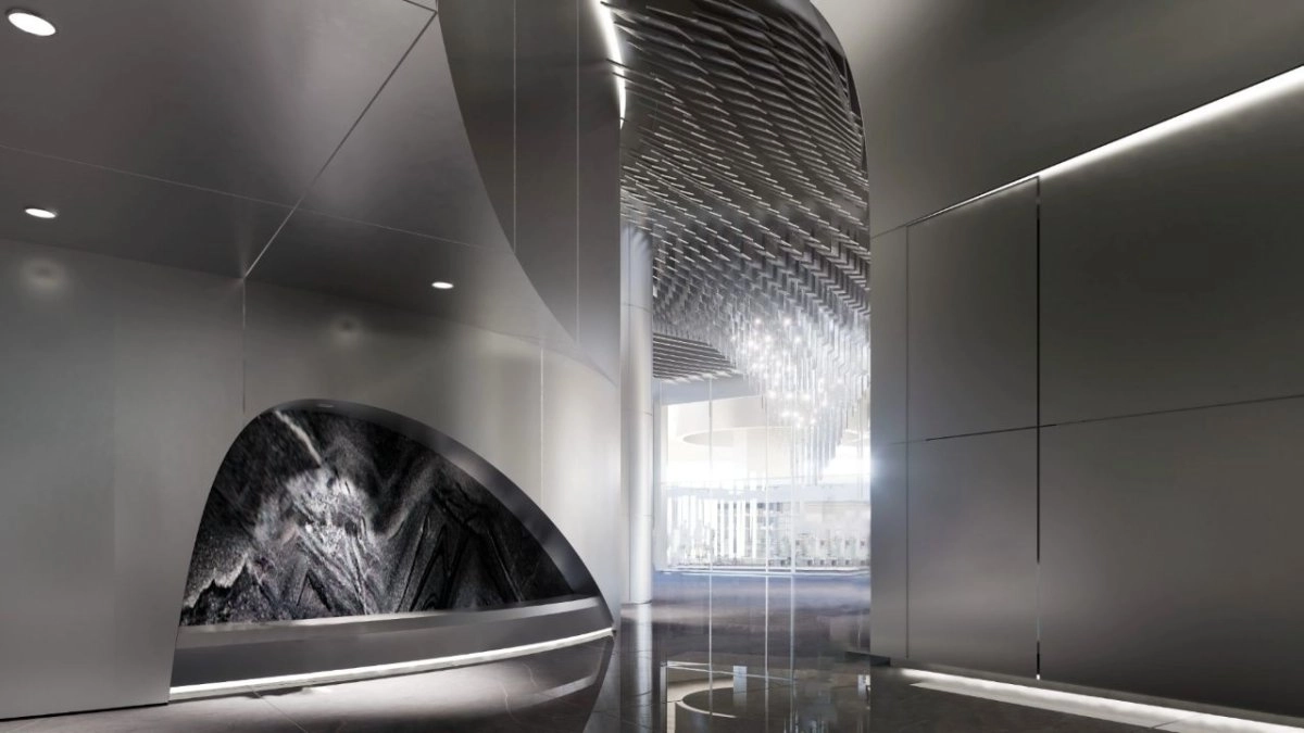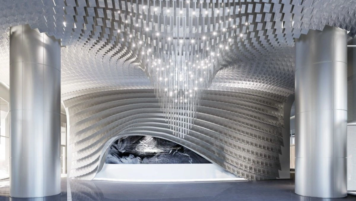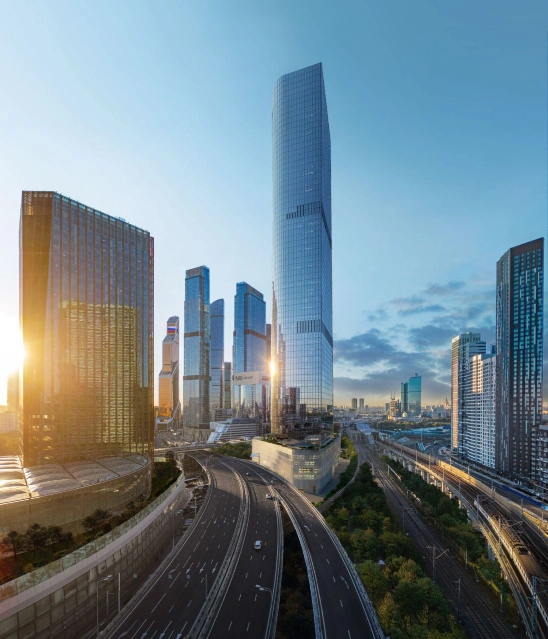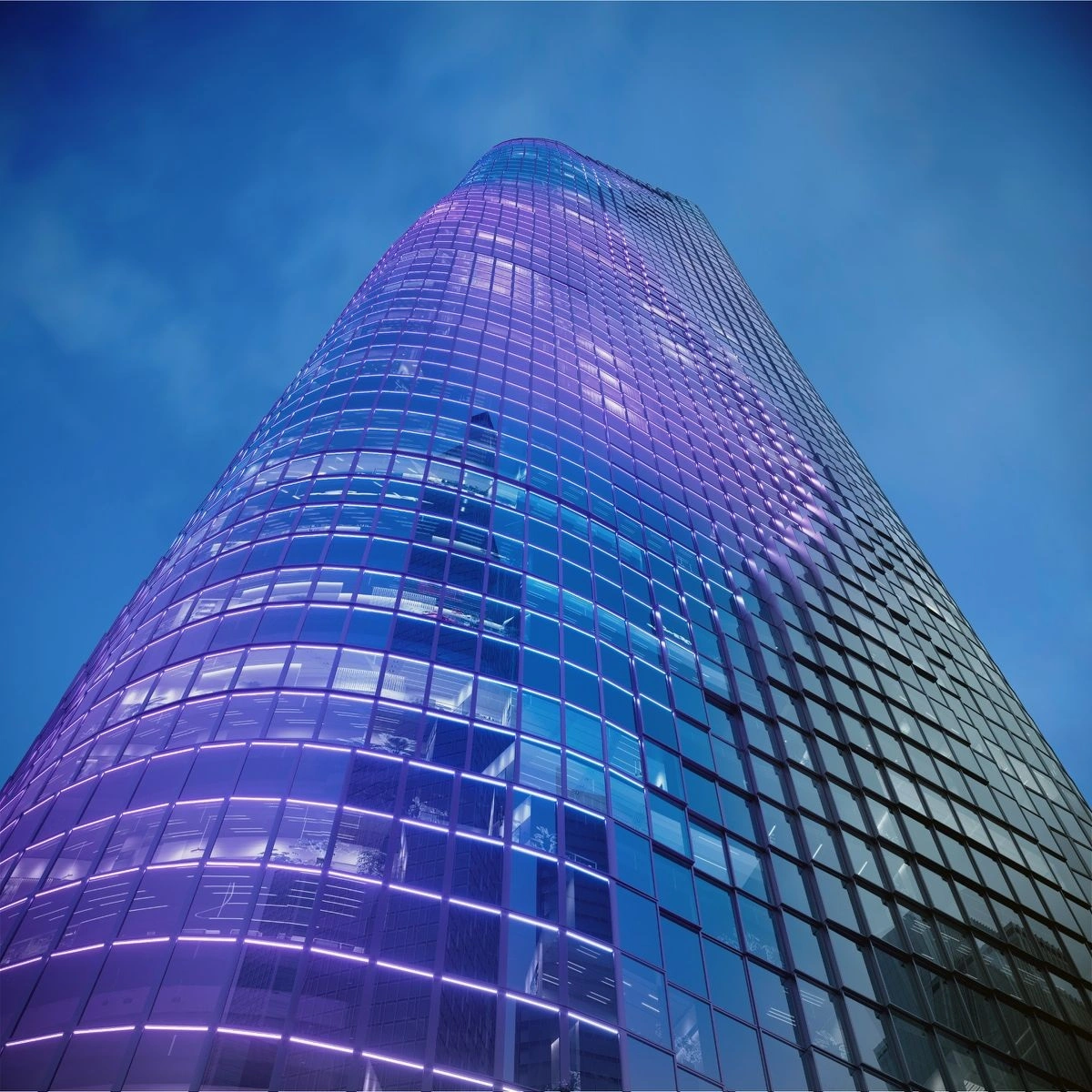 • Здание высотой 299 метров имеет уникальную форму без углов, вдохновленную движением волны, с выразительным волнистым стеклянным фасадом. Такая концепция не только создает запоминающийся образ, но и повышает устойчивость конструкции.